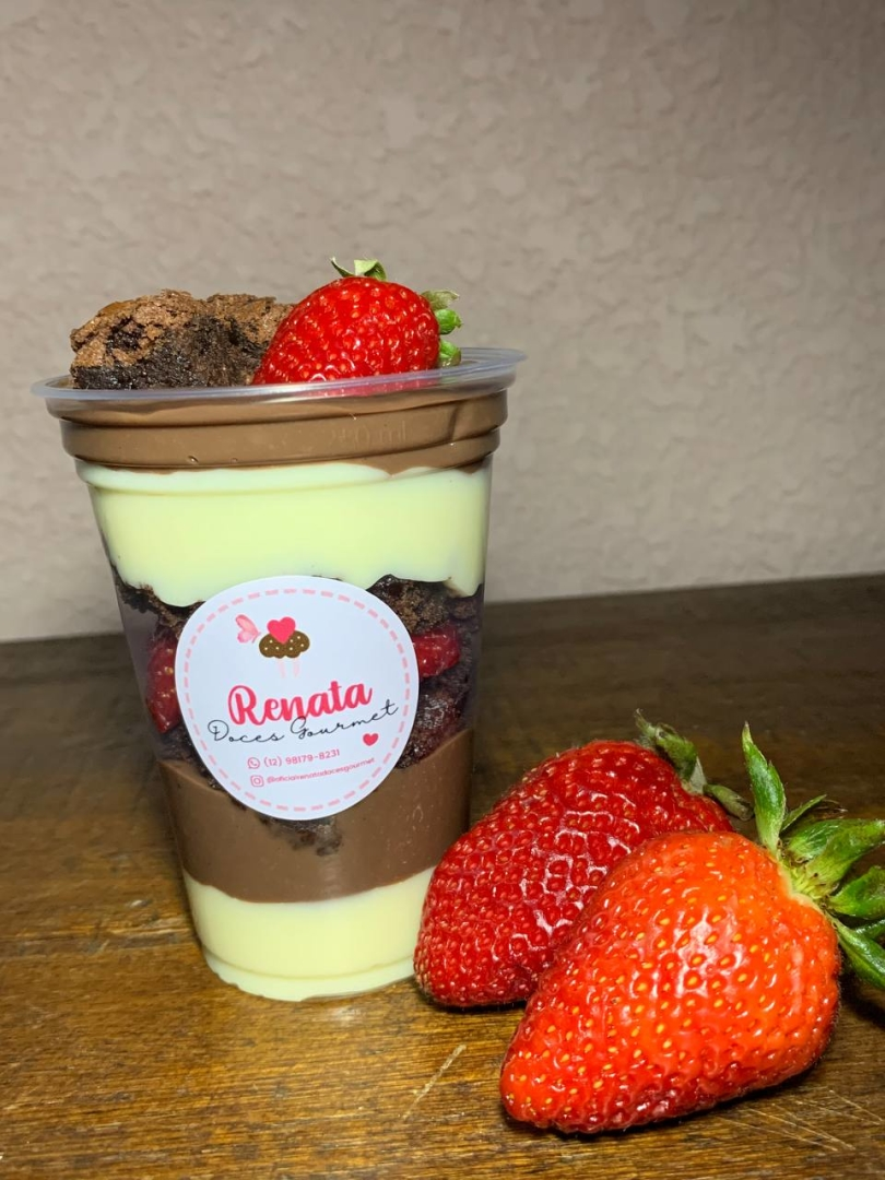 Delicioso Copo da Felicidade, sabor Morango com Brownie.