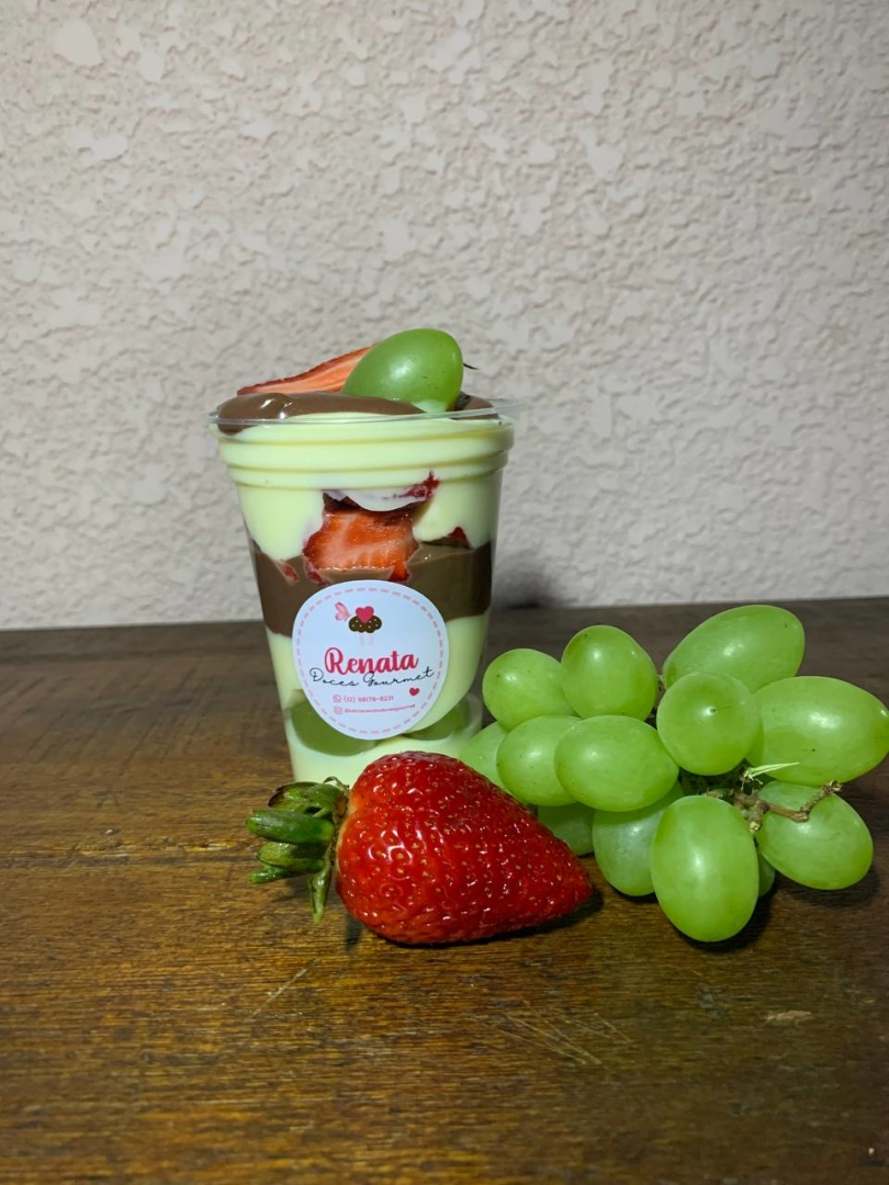 A união entre um delicioso creme de brigadeiro de chocolate nobre preto + creme de brigadeiro de chocolate nobre branco + pedaços de morango fresco e Uvas Frescas sem caroço.