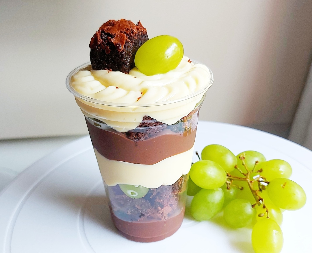A união entre um delicioso creme de brigadeiro de chocolate nobre preto + creme de brigadeiro de chocolate nobre branco + pedaços de Brownie Gourmet + Uvas Fresquinhas e sem semente.