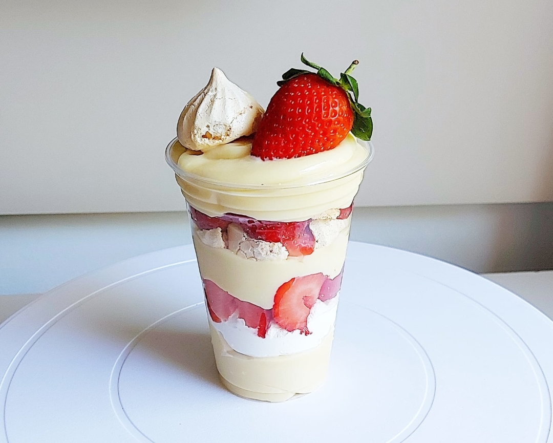 A união entre um delicioso creme de brigadeiro de chocolate nobre Branco + Chantily Cremoso + pedaços de Suspiro caseiro + Morangos frescos.